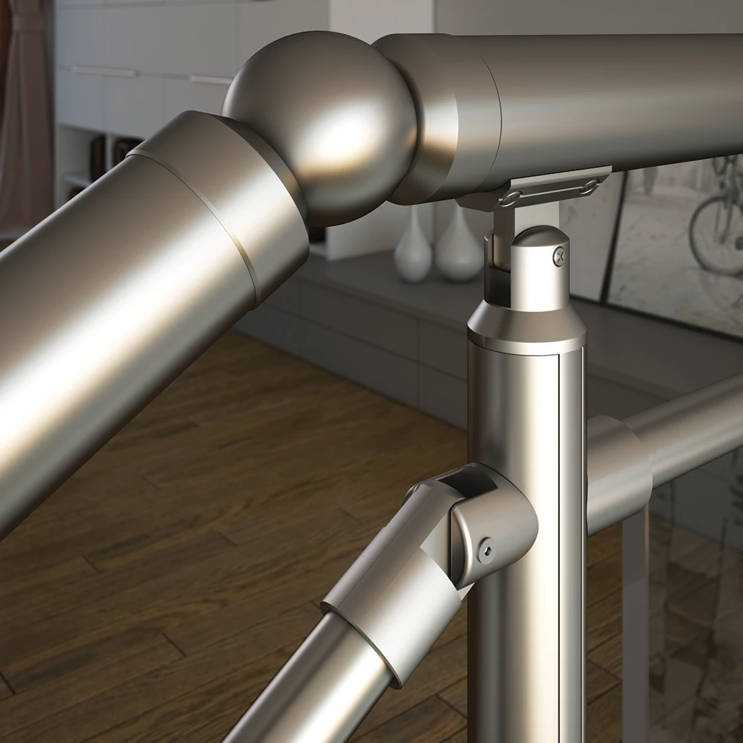 Komponent hliníkového zábradlia spojka okrúhleho madla Ø50mm a okrúhleho stĺpika Ø40mm nastaviteľný uhol je kľúčový komponent balkónového hliníkového zábradlia, ktorý spája okrúhle madlo AL_PR_001 s okrúhlym stĺpikom AL_PR_003 a zaisťuje stabilitu a pevnosť hlinikového zábradlia. Môže sa kombinovať s okrúhlymi priečkami AL_PR_007, ktoré sú k stĺpiku spojené držiakom pre okrúhle priečky AL_SMP_001 alebo AL_SMP_002.